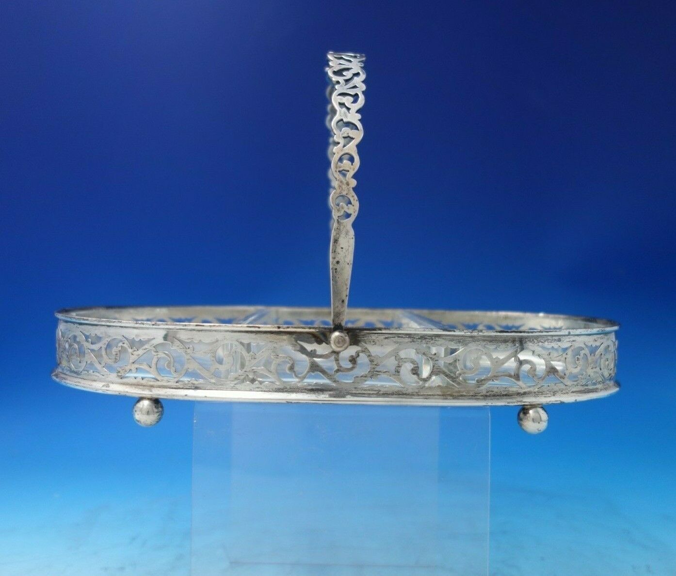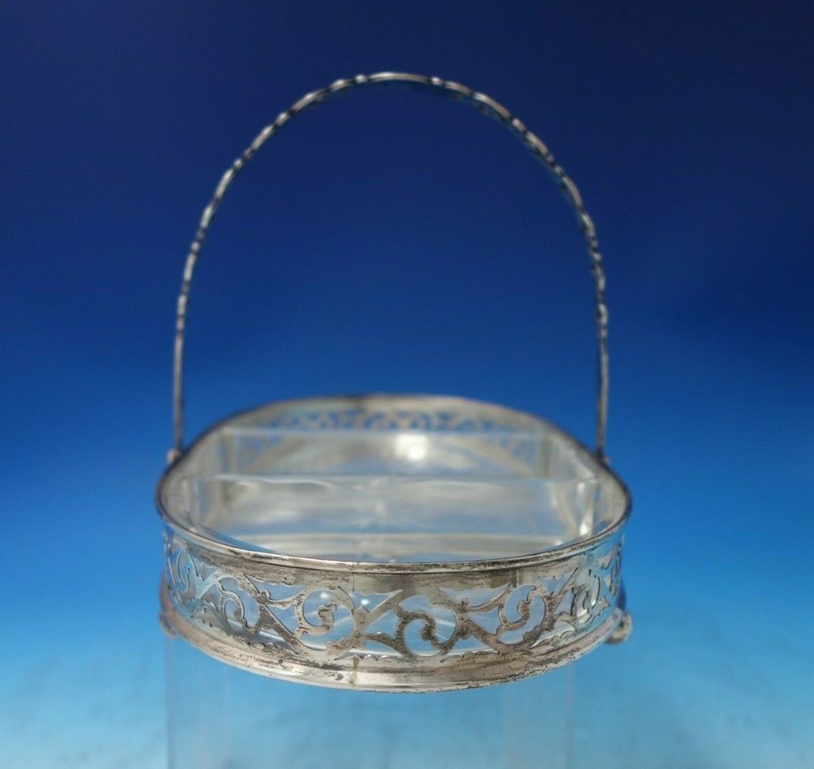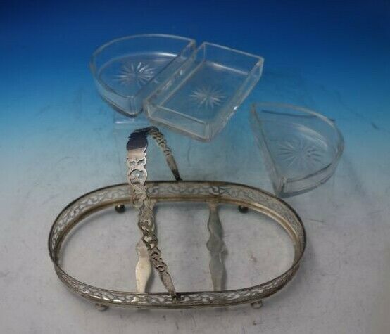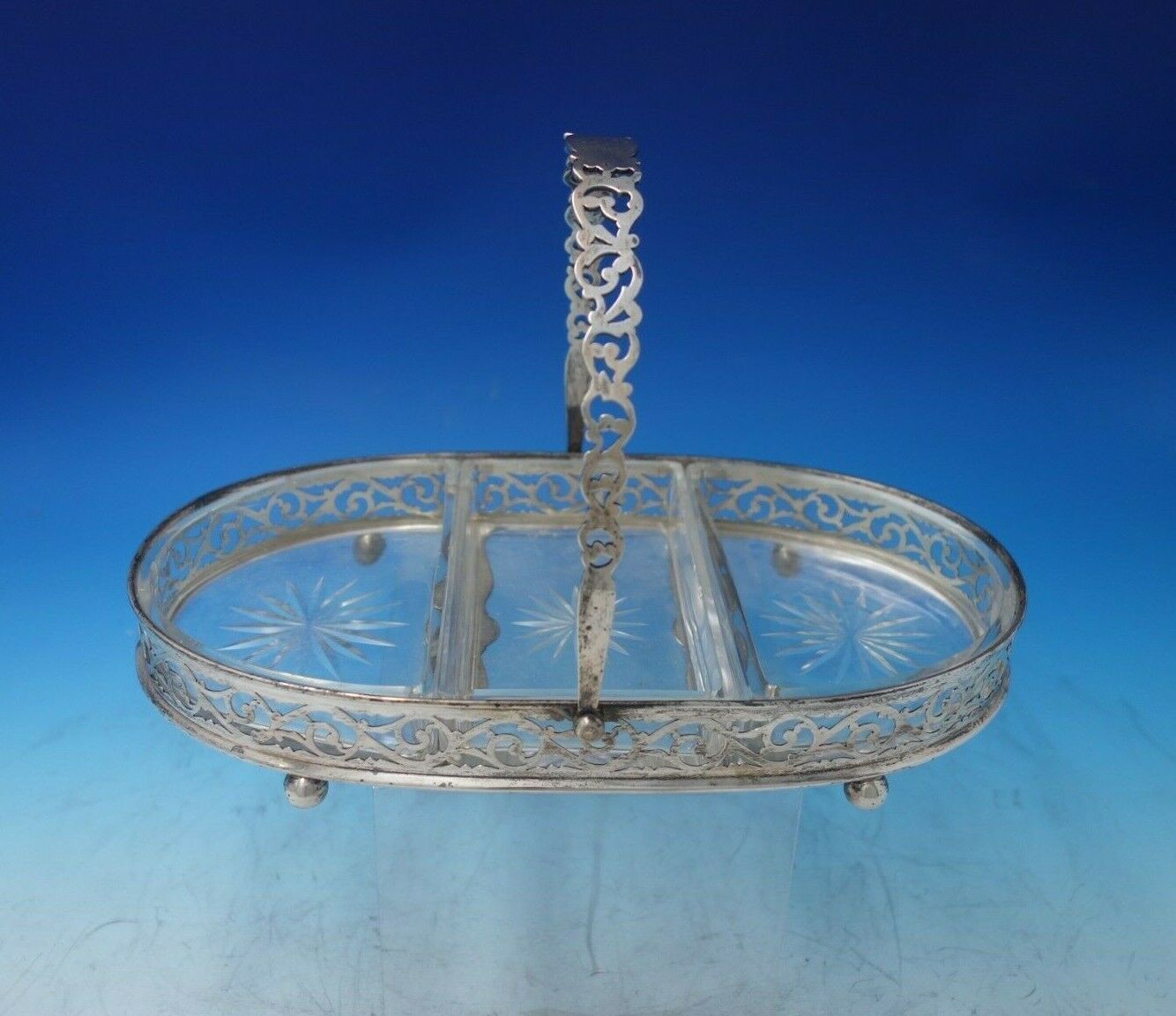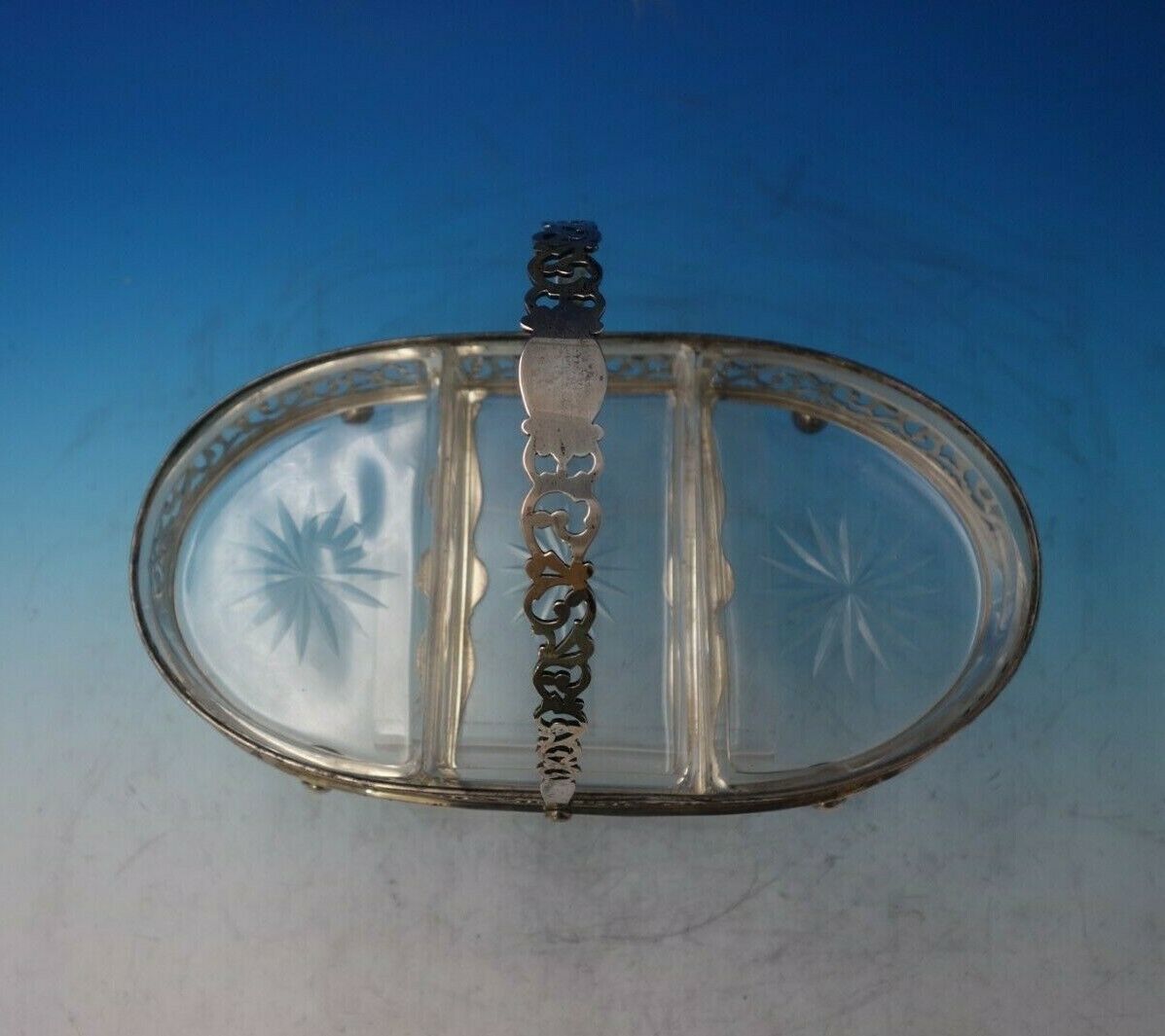 Remarkable George Henckel sterling silver appetizer serving tray with handle and three cut crystal inserts and ball feet, circa 1925. This piece measures 10 1/4" x 6" and weighs 8.2 troy ounces (without inserts). It is not monogrammed and is in good vintage condition. Beautiful!