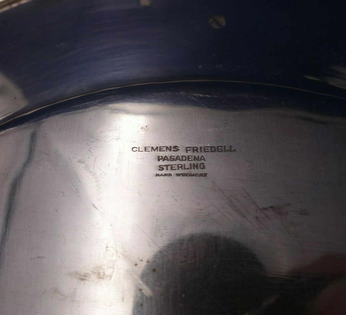 Remarkable Arts and Crafts by Clemens Friedell sterling silver charger plate made in Pasadena, California, circa 1912-1963. This piece measures 3/4" tall x 10 7/8" in diameter and weighs 16.4 troy ounces. It is monogrammed (see photos), and is in good vintage condition. Extraordinary piece!