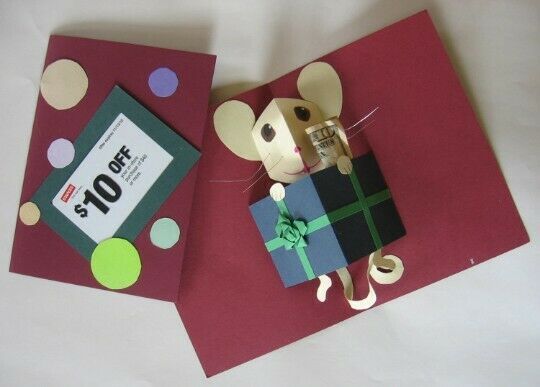 hand made pop up greeting card mouse with pockets for photos, gift cards, cash