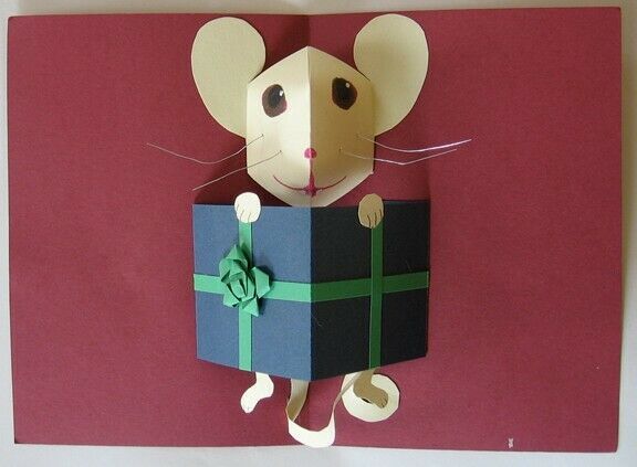 hand made pop up greeting card mouse with pockets for photos, gift cards, cash.