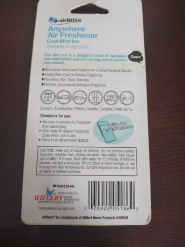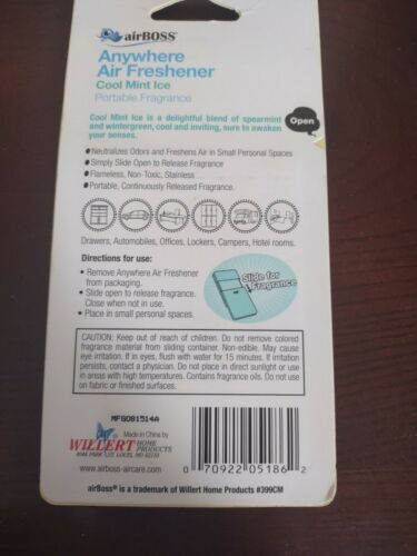 Airboss Anywhere Air Freshener Cool Mint Ice Portable Fragrance. MW168