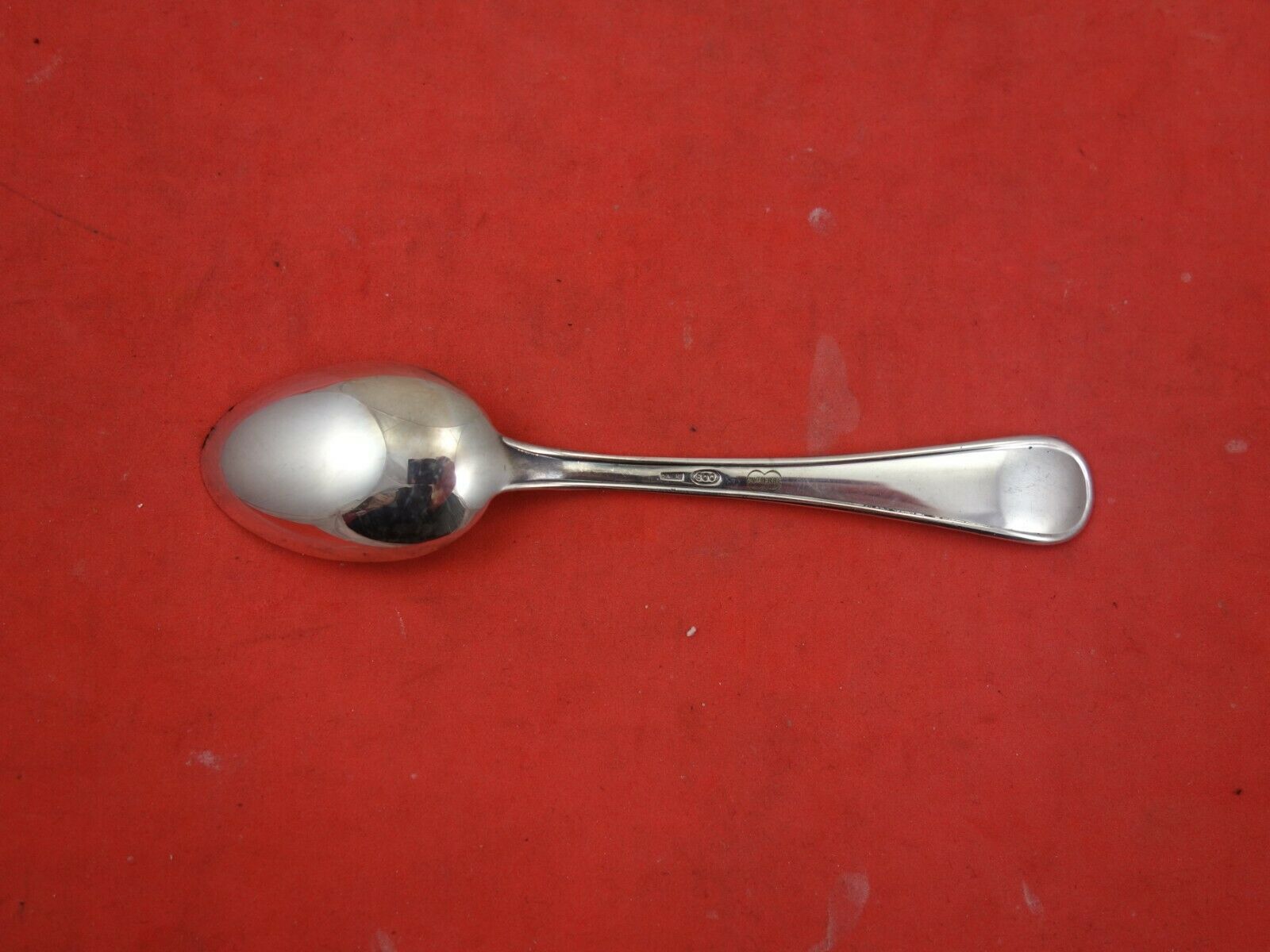 Italian .800 silver Demitasse Spoon, round and threaded, 4 1/8" by unknown maker. It is not monogrammed and is in excellent condition.