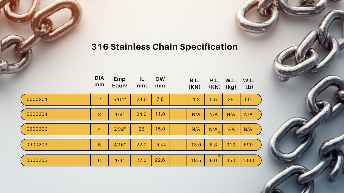 This is a quality marine grade stainless steel (AISI 316) chain ideal for marine applications or where corrosion resistance is required. Great for light applications that require corrosion resistance. Perfect for Dog Leash, Swings, Railing or any place high strength corrosion resistant chain is needed.