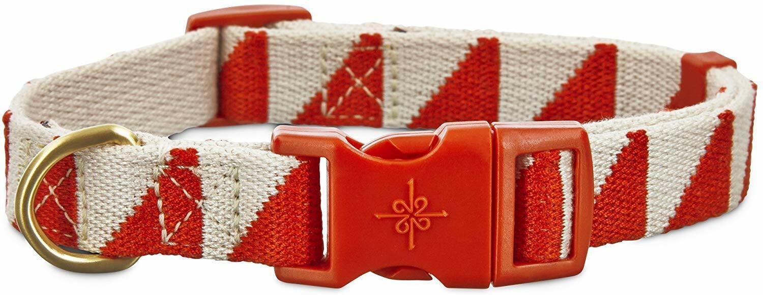 The Good2Go Geometric Triangle Dog Collar features a handsome and understated design in brick red and cream. A secure, red buckle closure clips close with ease, while a gilded D-ring provides an ideal place to attach tags and leashes.