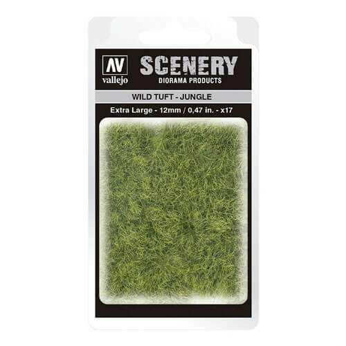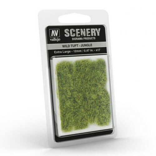 Vallejo Scenery - Wild Tuft - Extra Large - Jungle. Vallejo Scenery contains a wide range of sizes and references. Ready to use by simply peeling off each tuft individually and placing it in your scene. Self adherent to your base although they can also be fixed with PVA glue to get a tougher and more permanent adherence.