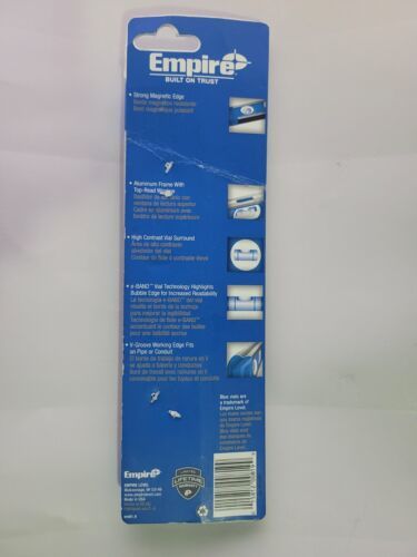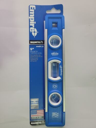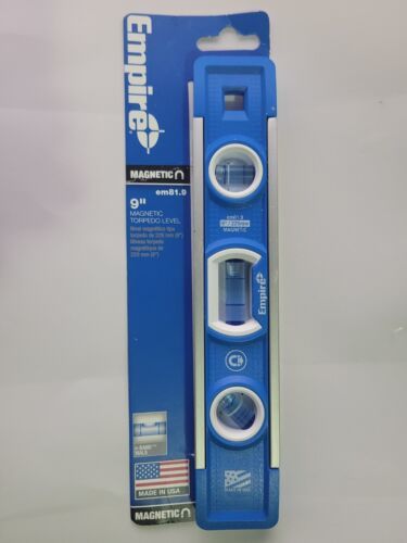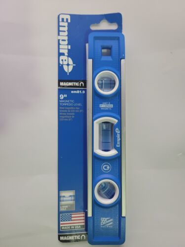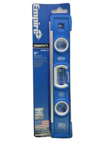 You are Buying a Brand New And factory Sealed Empire 9 in. Magnetic Torpedo Level iron or steel. 1-5/8 in. x 23/32 in. body. 360 vials-plumb, level, 450. Top reading feature. Magnetic strip on base holds fast to iron or steel. 1-5/8 in. x 23/32 in. body.