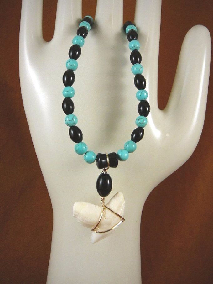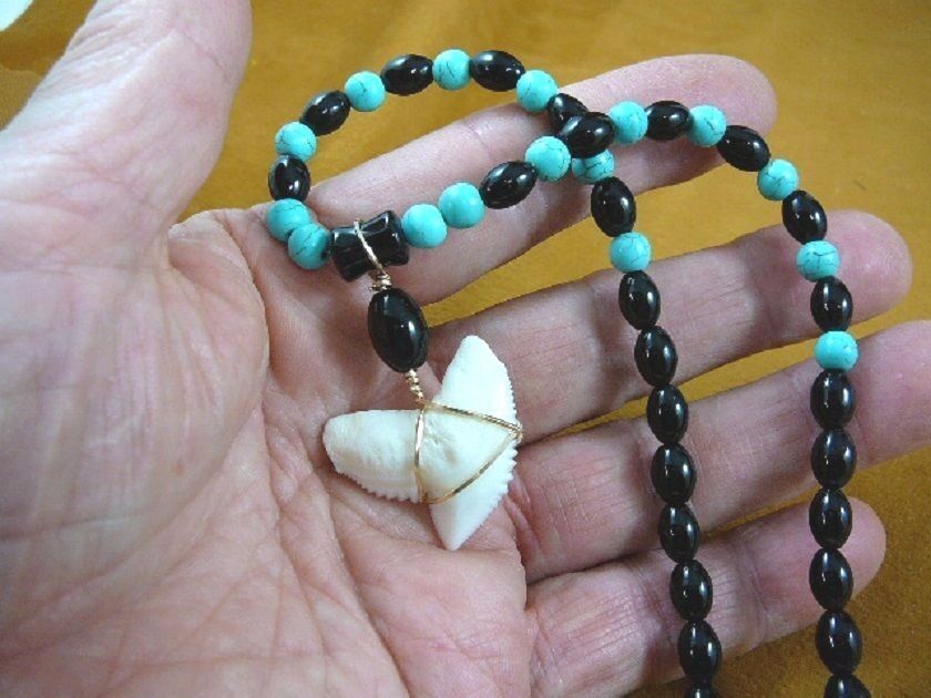 (internal #S5-42) Modern tiger shark tooth 1-1/4". Tooth wired as a pendant with gold tone wire, on 20" rice black onyx and round Chinese turquoise bead necklace (8x6 and 6 mm), with barrel twist closure.