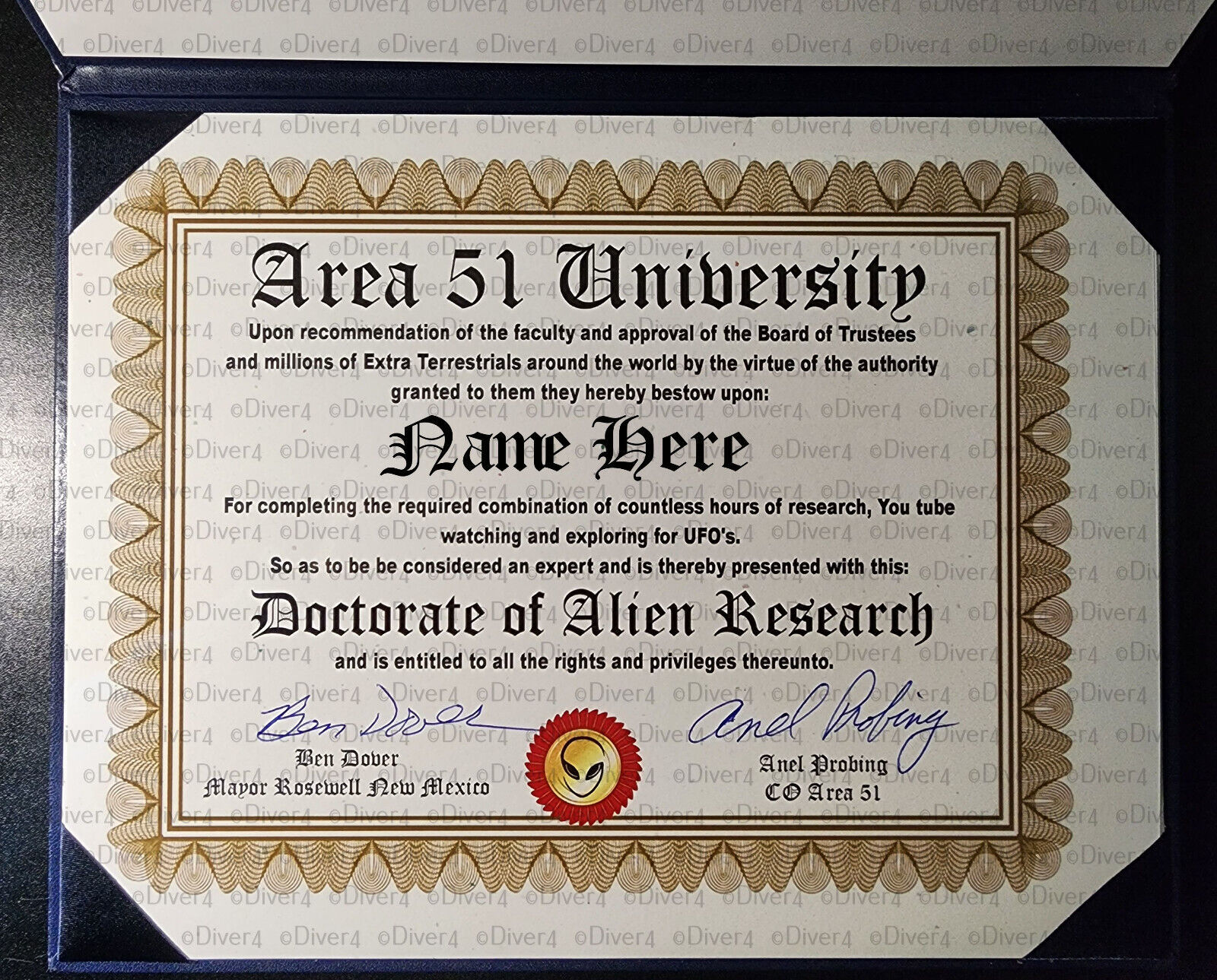 Personalised Deluxe Area 51 University Doctorate of Alien Research Certificate in Padded Binder