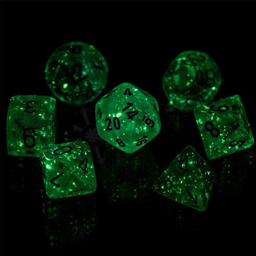 Chessex dice are the best rolling dice on the market, and Borealis line is their best-look sets to date! All dice read from the top for easy comprehension, with each number filled with high-contrast paint for easy visibility. The numbers also feature underscoring to differentiate the 6 from the 9. Sharp edges allow for easy shape recognition. Plastic display case included. The Luminary line includes materials that give the dice a speckled look in the light, but a starry field effect in the dark. This polyhedral set contains one D20, one D12, two D10 (00-90 and 0-9), one D8, one D6, and one D4.