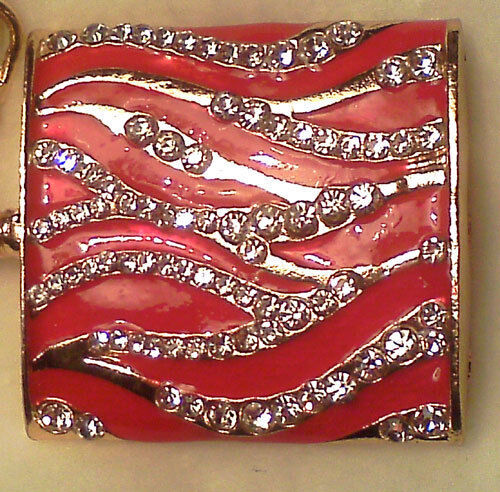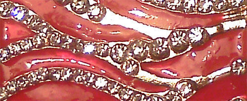 Red miniature perfume bottle covered in small stripped flame inspired diamond rhinestone that work they way up the perfume bottle.