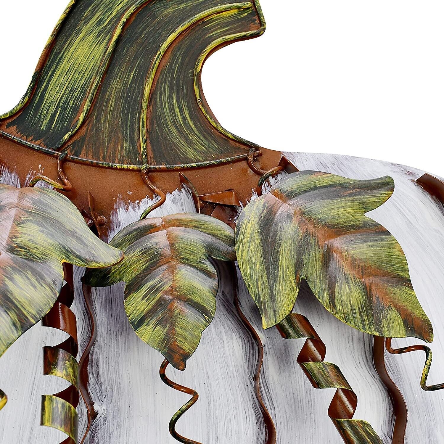 The pumpkin garden stake is made of metal featured with hand crafted leaves and curly spirals that add a lifelike character.