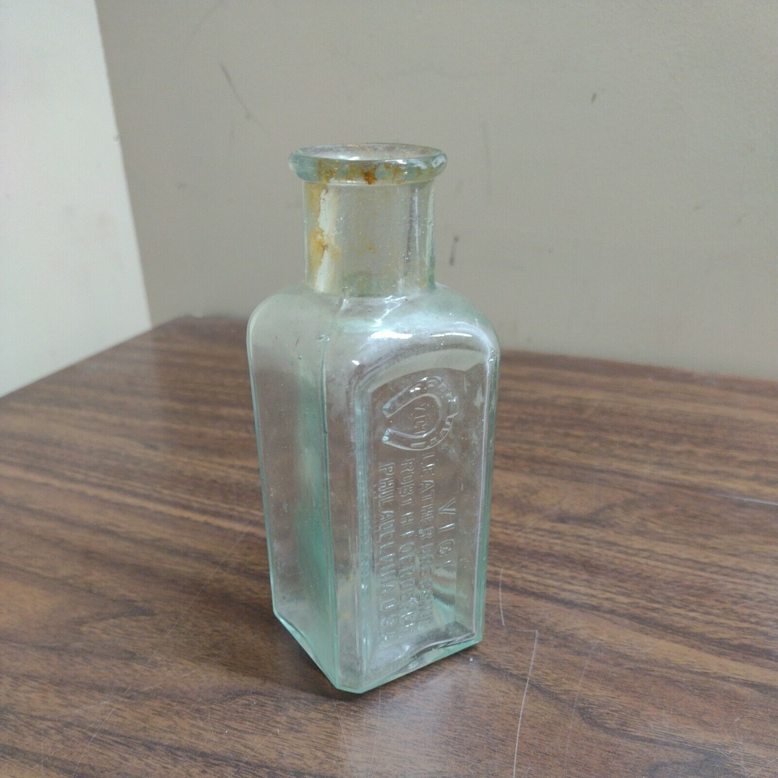OLD Aqua VICI Leather Dressing Bottle. Robt. H. Foerderer Philadelphia HORSESHOE