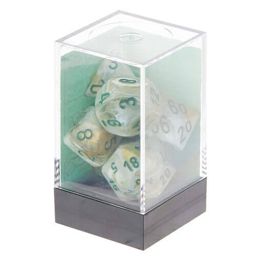 Chessex Polyhedral 7 Die Set. Contains 1xD4, 1xD6, 1xD8, 2xD10, 1xD12, 1xD20 in a clear plastic box.