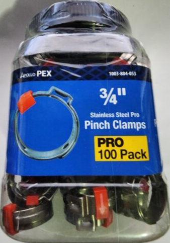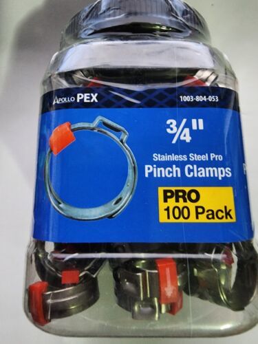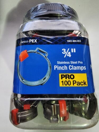 You are Buying a brand New And Factory Sealed Apollo 3/4 in. Stainless Steel PEX-B Barb Pro Pinch Clamp Pro Pack (100-Pack) Model # PXPRO34100JR ApolloPEX fasteners can be can be used with brass and plastic fittings, valves, and manifolds (all sold separately). The ApolloPEX system is a comprehensive piping system comprised of brass fittings, poly alloy fittings, manifolds, valves, fasteners, tools and tubing designed for implementation in water delivery systems, simple or complex.