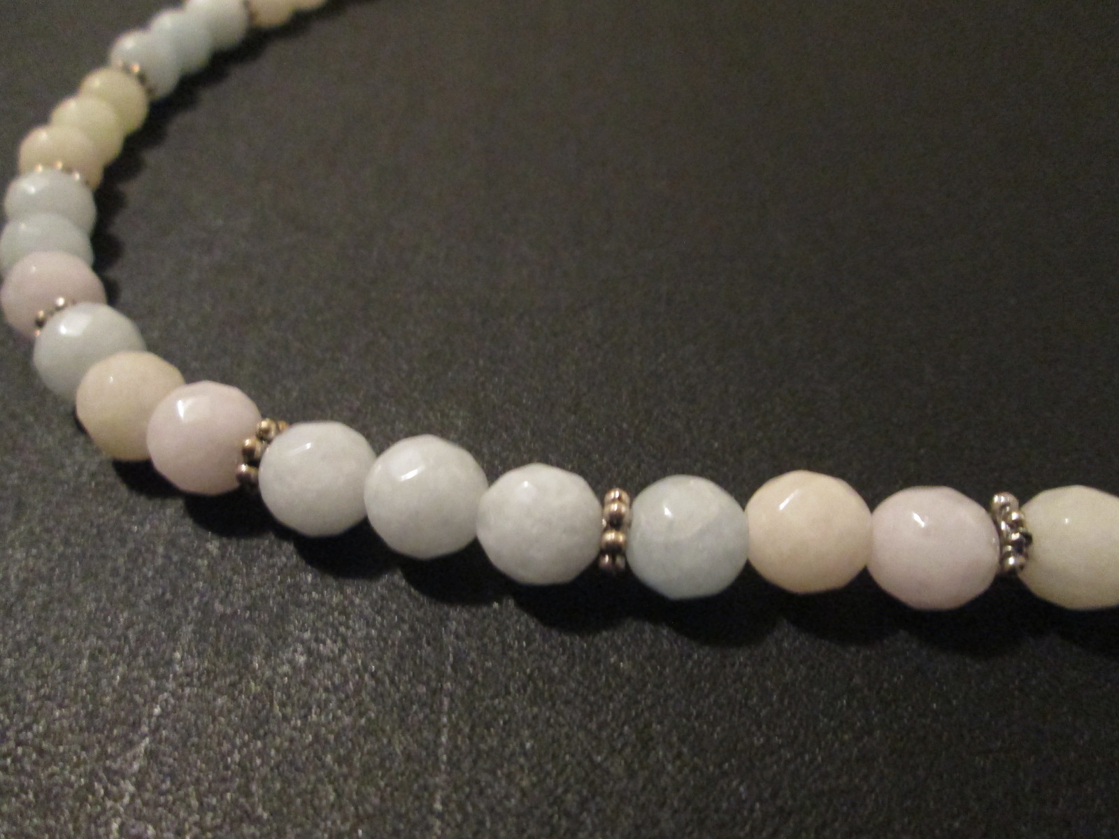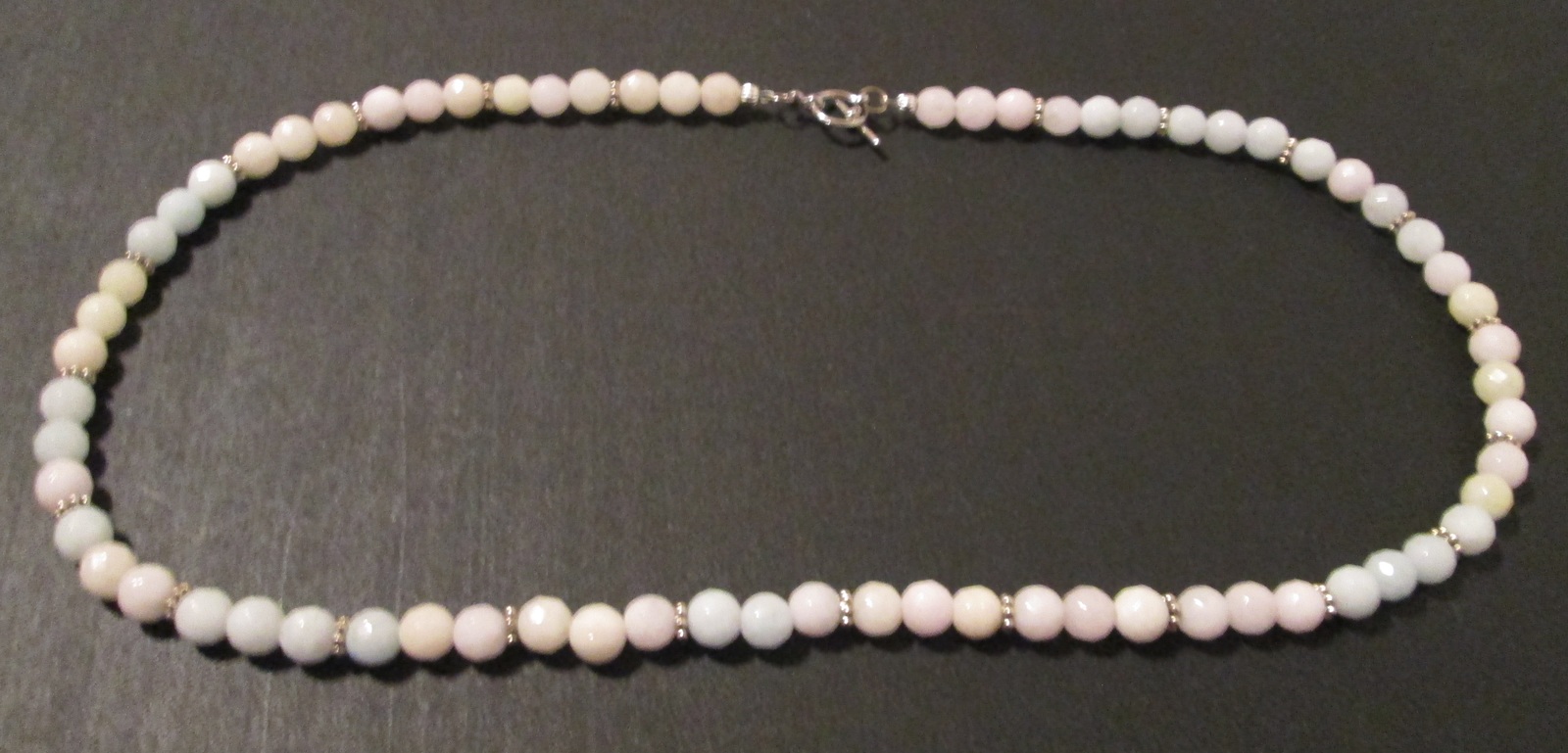 Beaded necklace made with faceted pastel beads and silver spacers. Beads are 8 mm. Spacers are about 6 mm wide. The necklace is 24 inches long. Has silver findings, including toggle clasp (if you want to change it to lobster clasp, let me know!). The necklace was also made with fairly flexible beading wire.