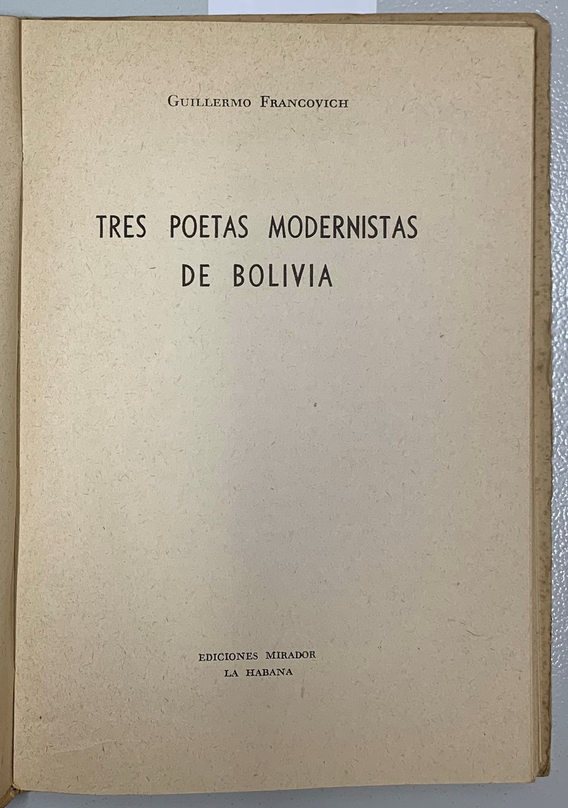 In Spanish. Short description: Guillermo Francovich. Tres poetas modernistas de Bolivia, Habana, 1960's. Please feel free to contact us for a detailed description of the copies available. SKUZLO000379