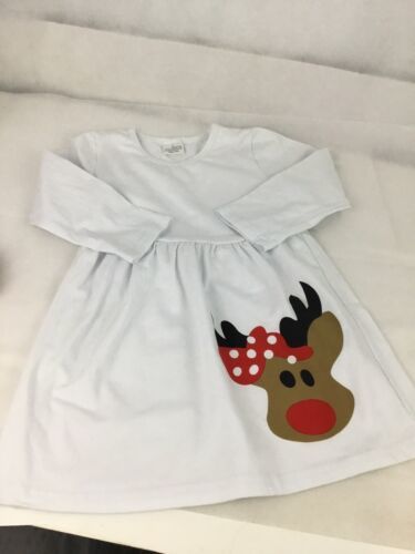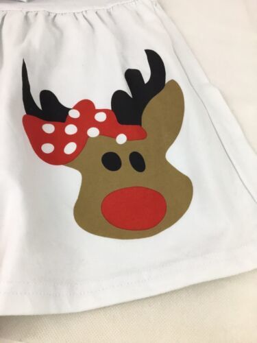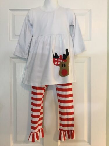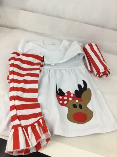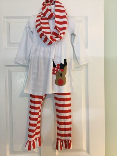 New toddler large set with reindeer on front. Set includes striped pants, pull on and elastic waist, top, and striped scarf. Tags had been removed. Back of top has a small spot in seam where arm hole is. Spot may come out when laundered. Estimate a 3T size please consider measurements; pants length is 24? and length of top is 20?. Chest of top is 11?. Please use the measurements as a guide to determining fit odor child