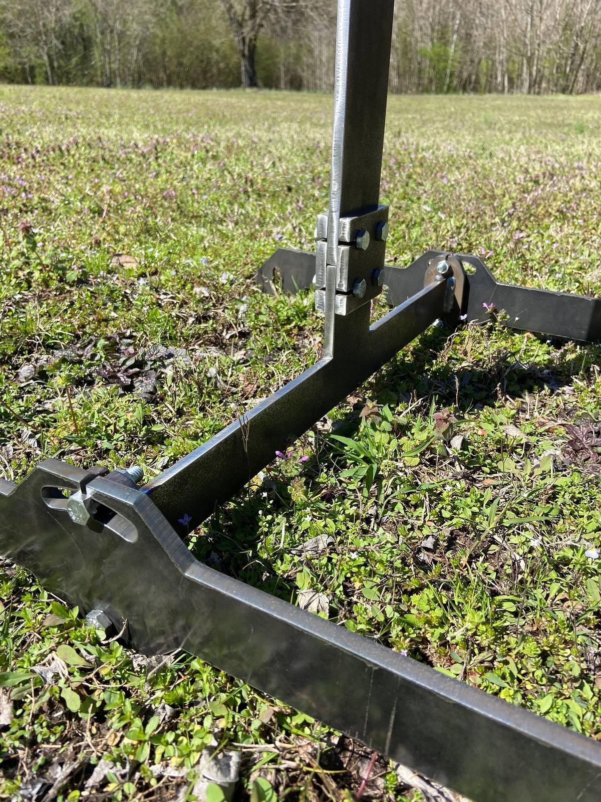 The Base comes pre-welded with mounting brackets on either side for the 24โ Legs. The Legs will be mounted using (4) included 3/8" bolts and nuts. We recommend a straight upward angle perpendicular to the ground.