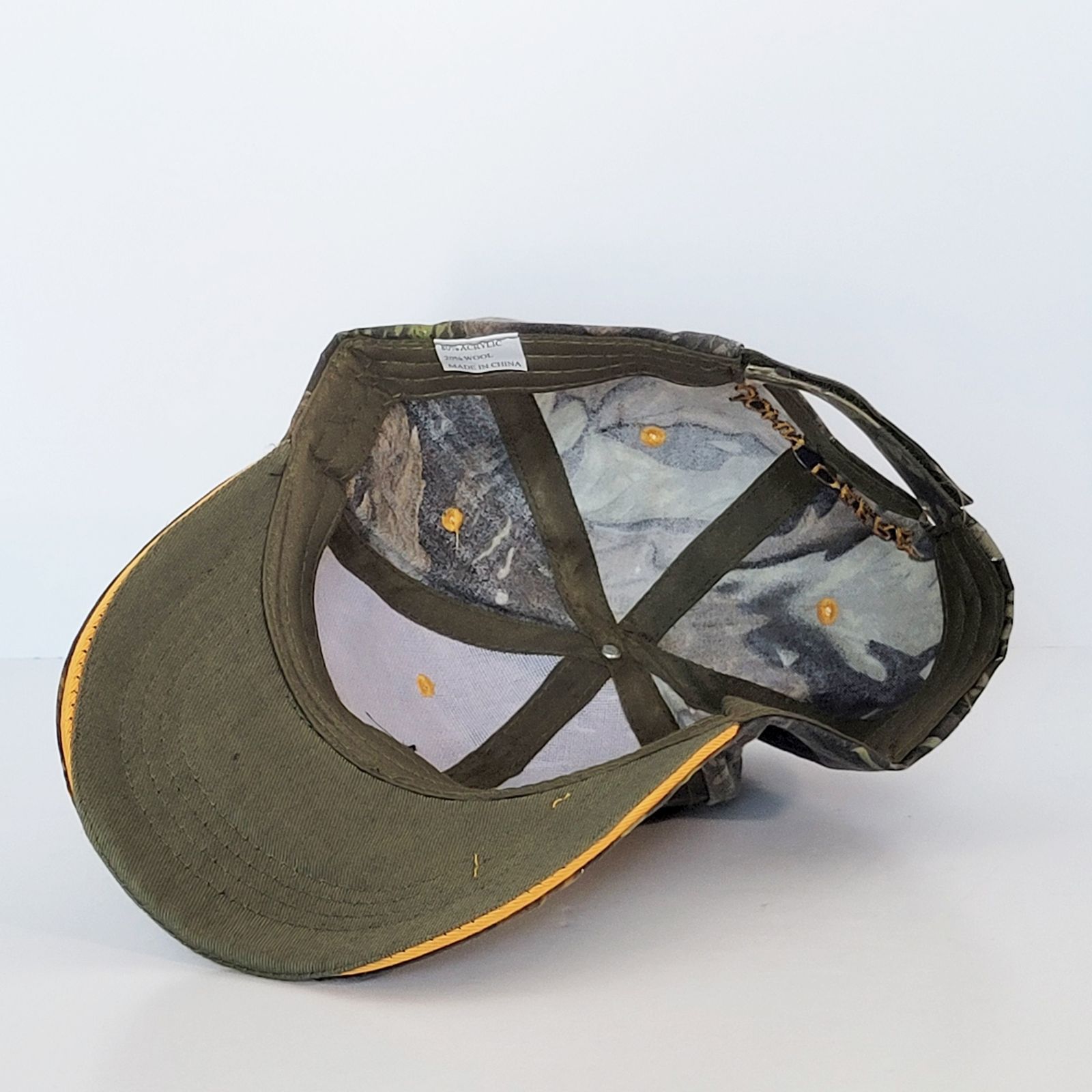 The cap is camouflage with embroidery on the front and back.