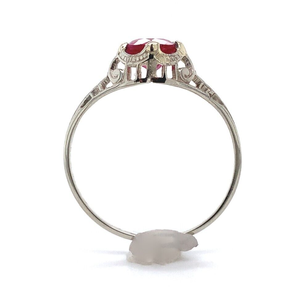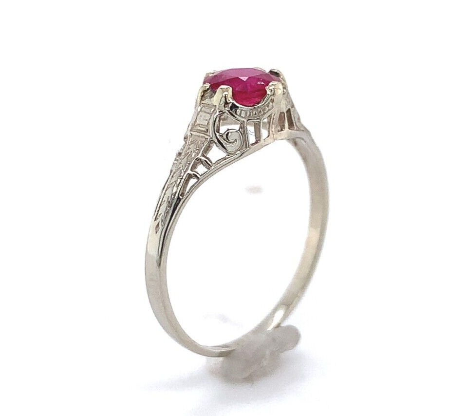 Art Deco 14k white gold filigree ruby ring. The ring features a genuine earth mined round pinkish-red ruby weighing .67cts. The ruby measures about 4.8mm. There are some nicks near one of the prongs. The ring fits a size 4.5 finger. It weighs .67 dwt., and dates from the 1920s. Pretty!