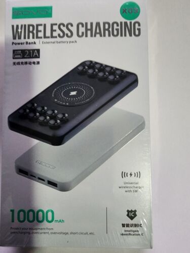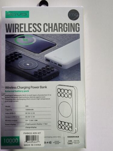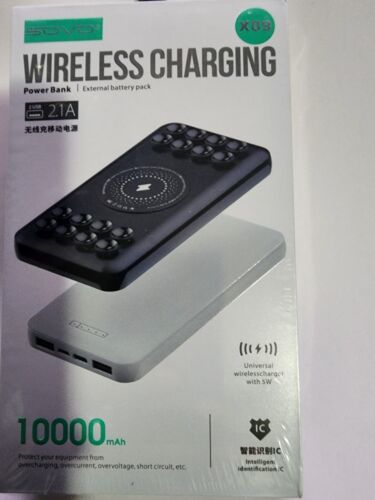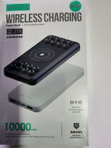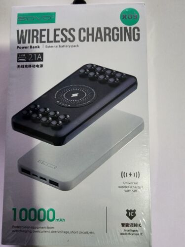 You are Buying a Brand New And Factory Sealed SOVO 10000mAh Fast Wireless Power Bank with Black Anti-Slip Suction Cups. 21A USB-C PD Portable Charger Compatible with iPhone 14, 13, 12, 11, SE 2020, X, XR, XS, Samsung S23, S22, S21, S20, S10, S9....Anti-slip Suction Cups: These suction cups securely attach to your phone, enabling you to use it freely to chat, use social media, or play games while charging. If they lose grip, simply wipe them with a damp cloth.