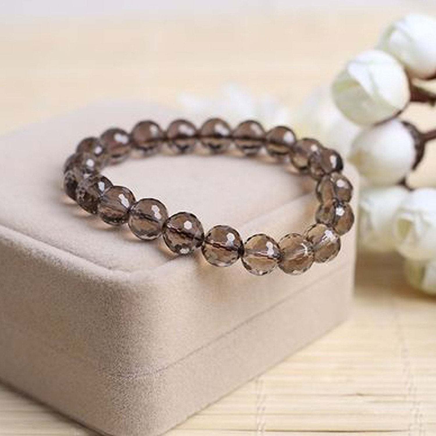 This bracelet is expertly crafted with smokey quartz beads, each cut to 8mm for a stunning diamond-like shine. The smokey quartz is known for its grounding and protective properties, making this bracelet not only a beautiful accessory but also a source of potential benefits. Elevate your style while feeling balanced and protected with this exquisite bracelet.