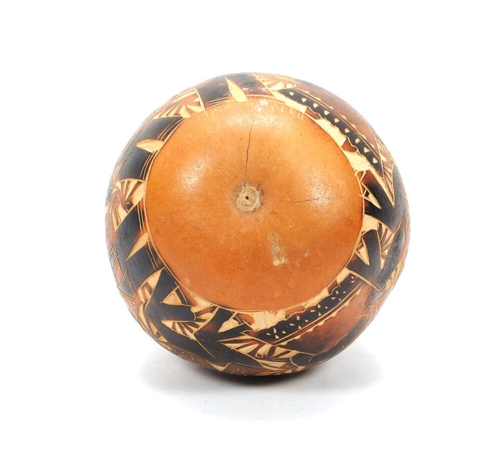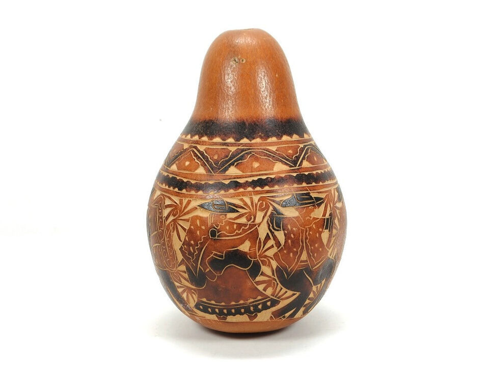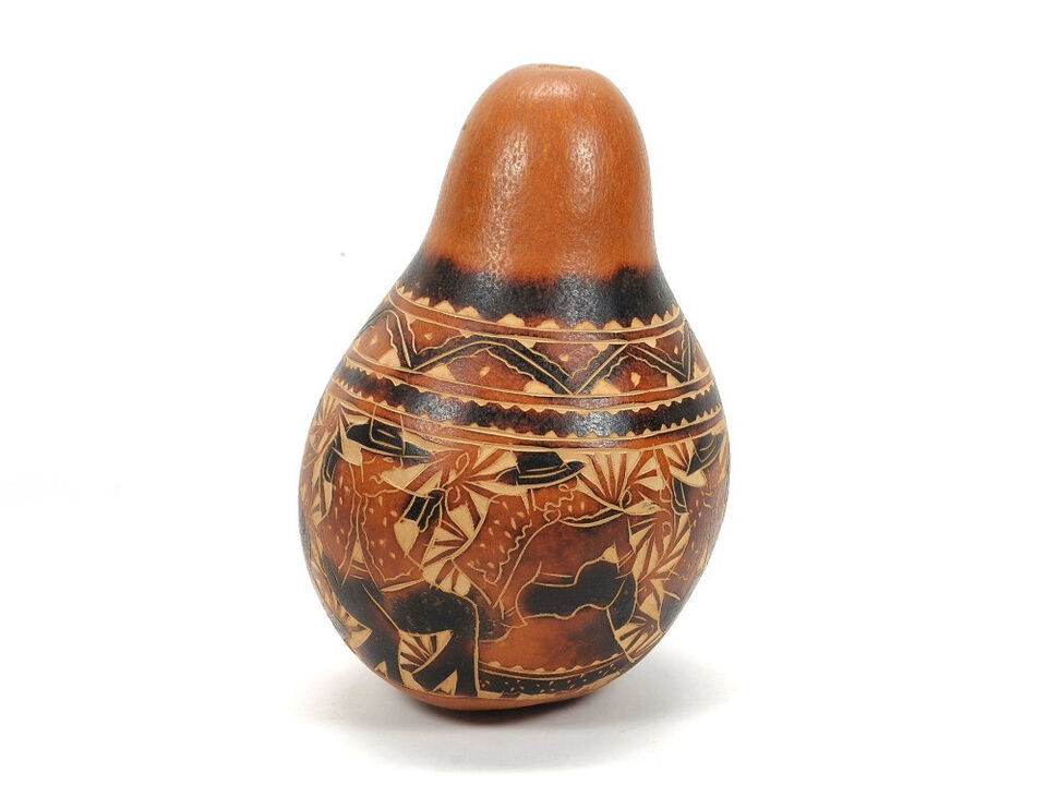 Peruvian Hand Carved Gourd Rattle Musicians Dancers Folk Art South America 5.5"