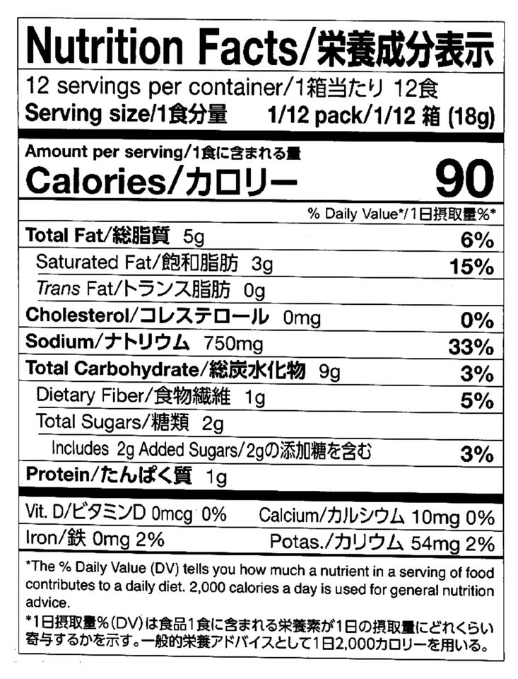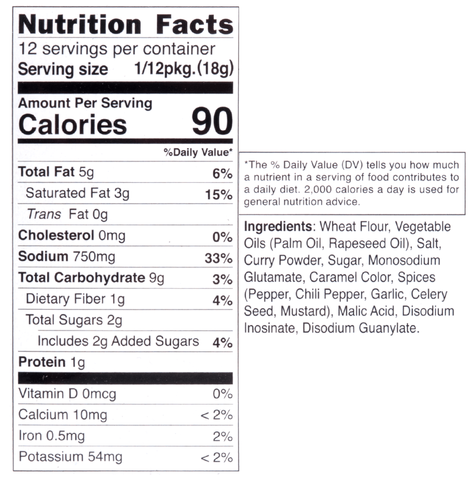 โข Ingredients: Wheat flour, Vegetable oils (Palm oil, Rapeseed oil), Salt, Curry powder, Sugar, Monosodium glutamate, Caramel color, Pepper, Malic acid, Chili pepper, Garlic, Disodium guanylate, Disodium inosinate, Celery seed, Mustard.