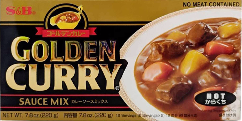A block of Golden Curry Mix consisting of curry powder, flour, spices and seasoning could quickly transform mundane stew into fine curry simply by adding them to the mixture. Spiciness stands out in the rich taste. It is perfect for those who like spicy food. S B Golden Curry Mix contains no meat or meat derived ingredients.?