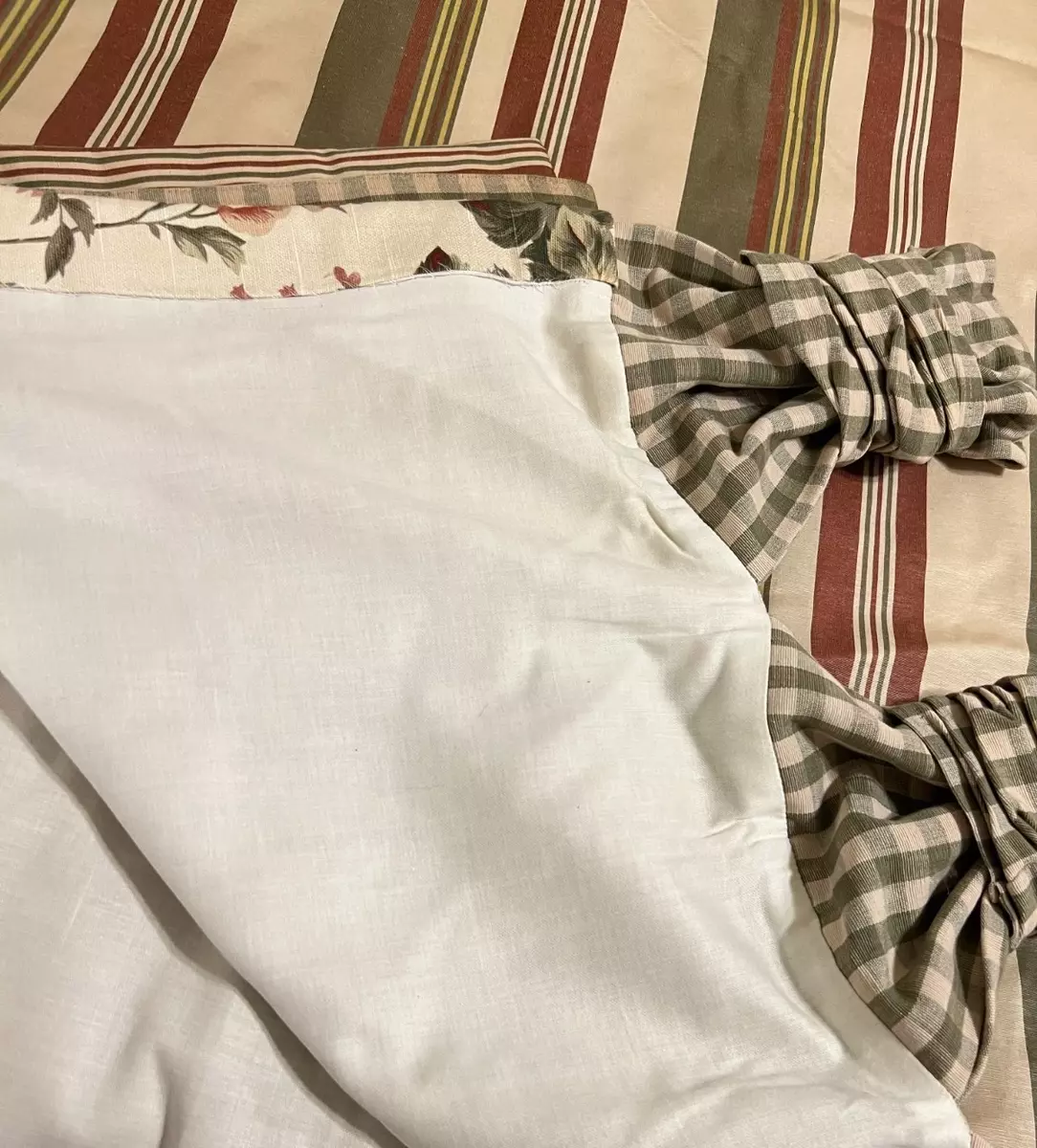 All trimmed in gingham on both sides of drape. Wraps around tab-tops can be removed.