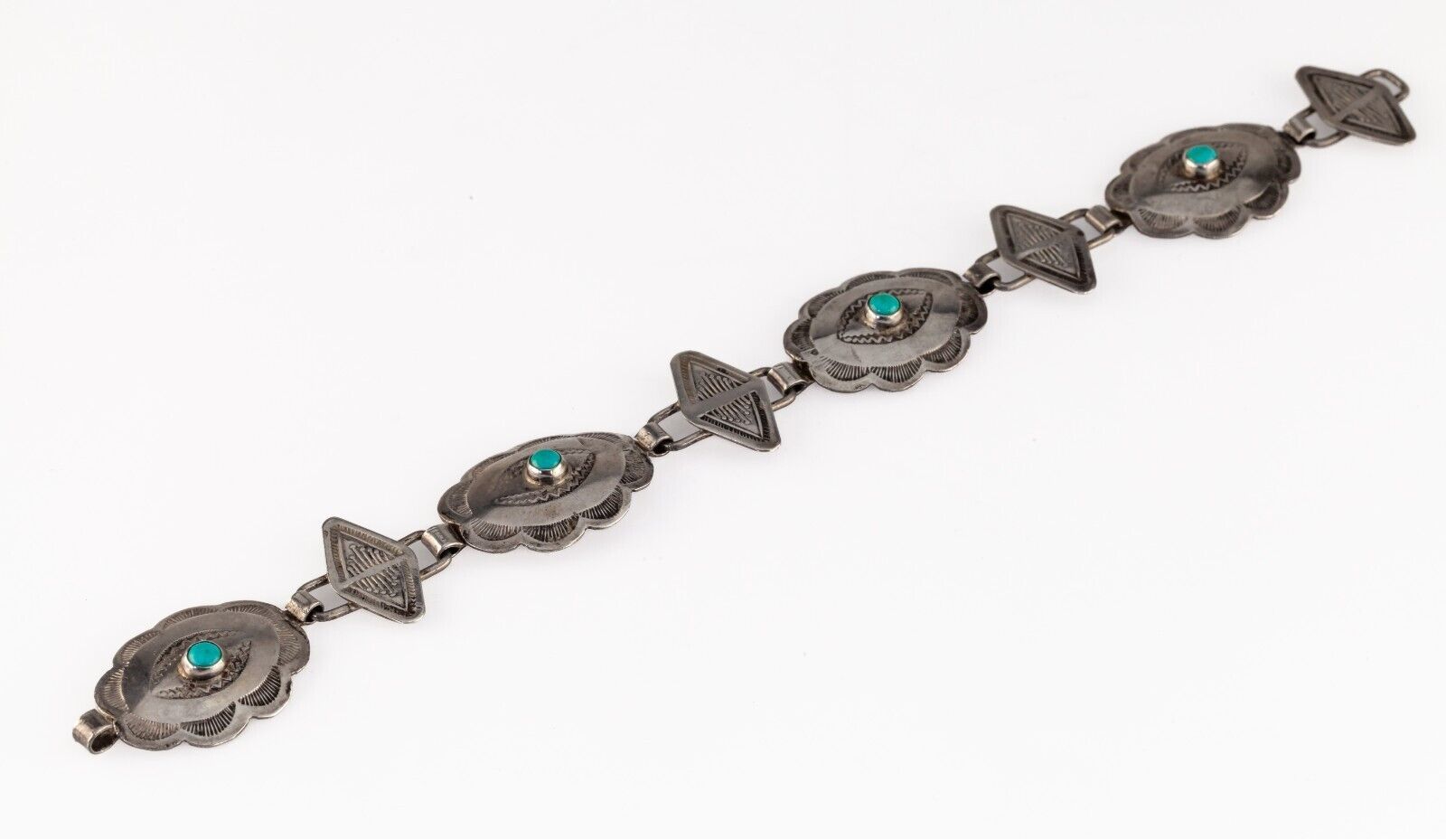 Native American Concha Sterling Silver Bracelet with Turquoise, 8" Long 18.2gr