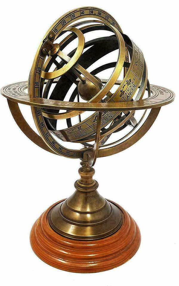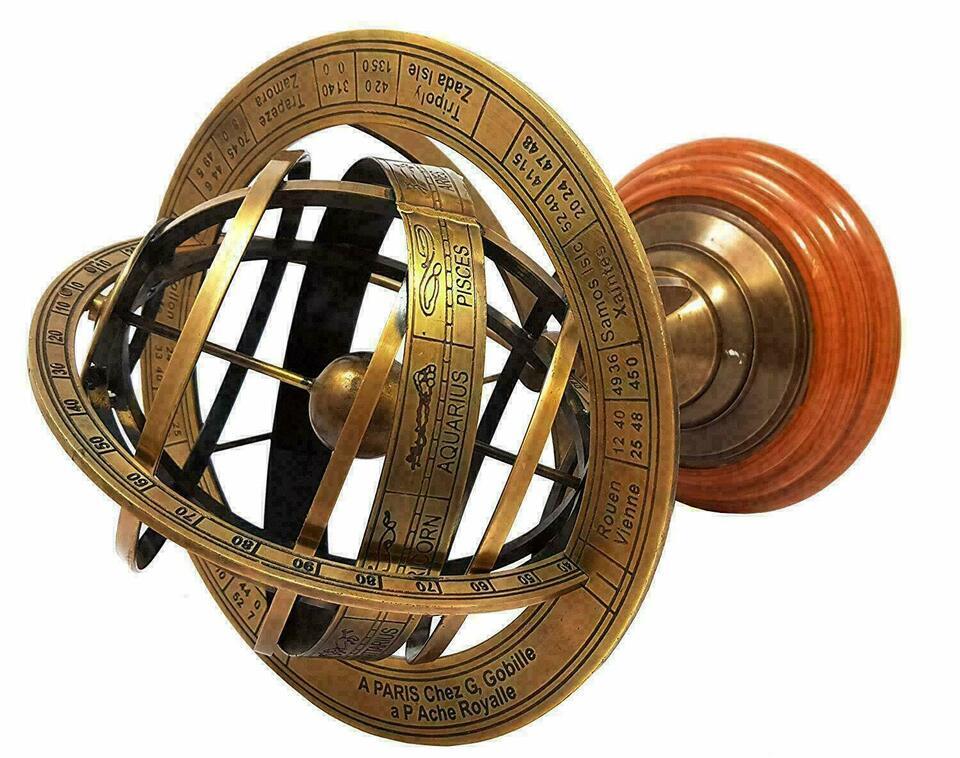 10" Antique Nautical Vintage Handmade Brass With Wooden Sphere Globe Armillary