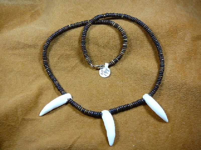 (#G159-901) You are bidding on a necklace made with THREE 1-3/8" gator t**th on a 20" brown species: brown natural organic bead necklace; barrel twist clasp closure. ONE OF OUR MOST POPULAR NECKLACES. We make these necklaces ourselves and recommend them for their unique designs and high quality of products. A great gift to the gator lover or to yourself!