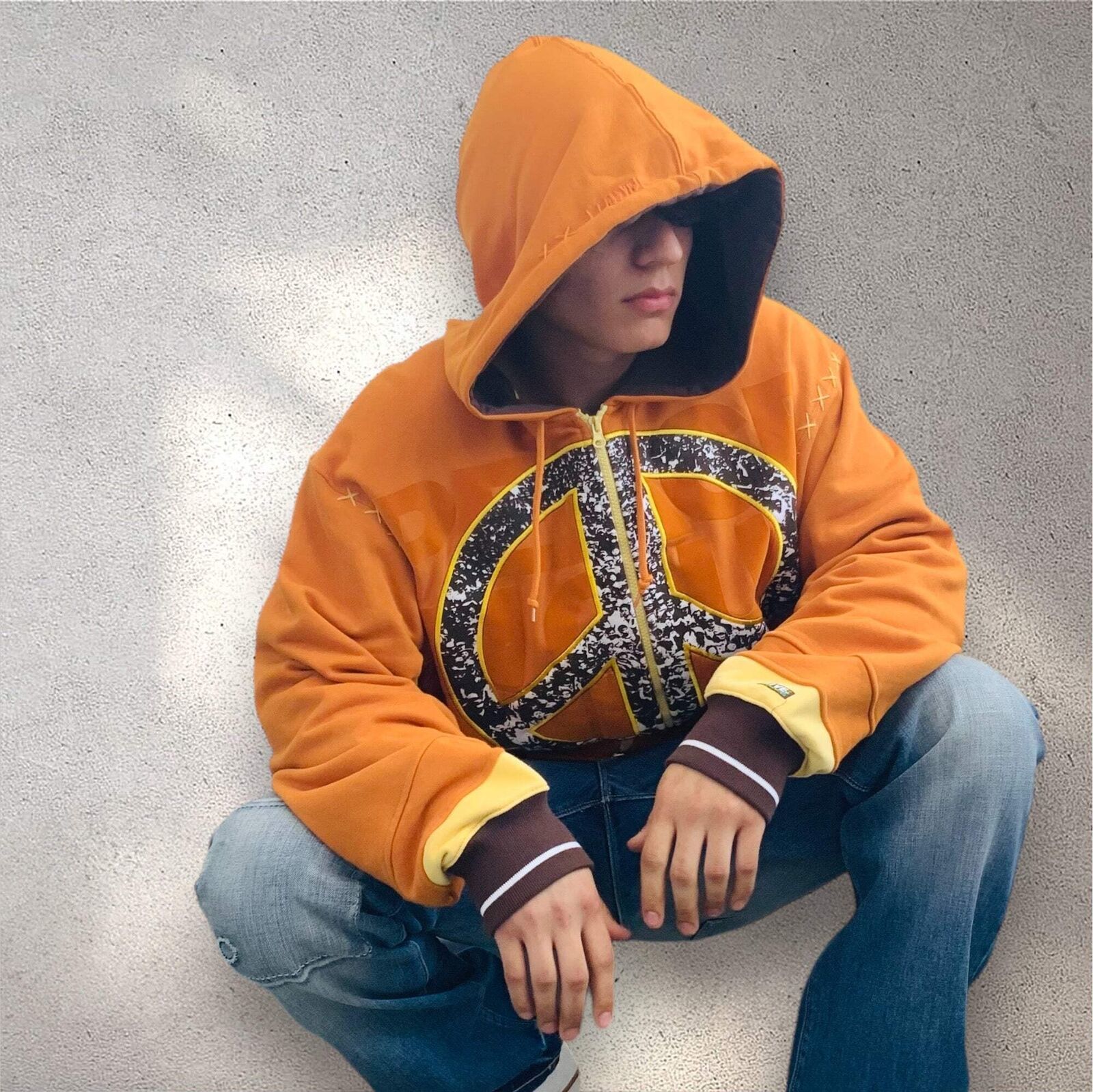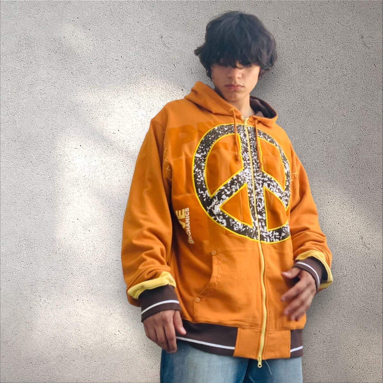 This men's hoodie from Live Mechanics is a unique addition to any wardrobe, featuring an old school aesthetic and great quality for lasting wear. Stand out with the burnt orange peace sign design, while staying warm and comfortable. Brand new with tags for a fresh, one-of-a-kind look.