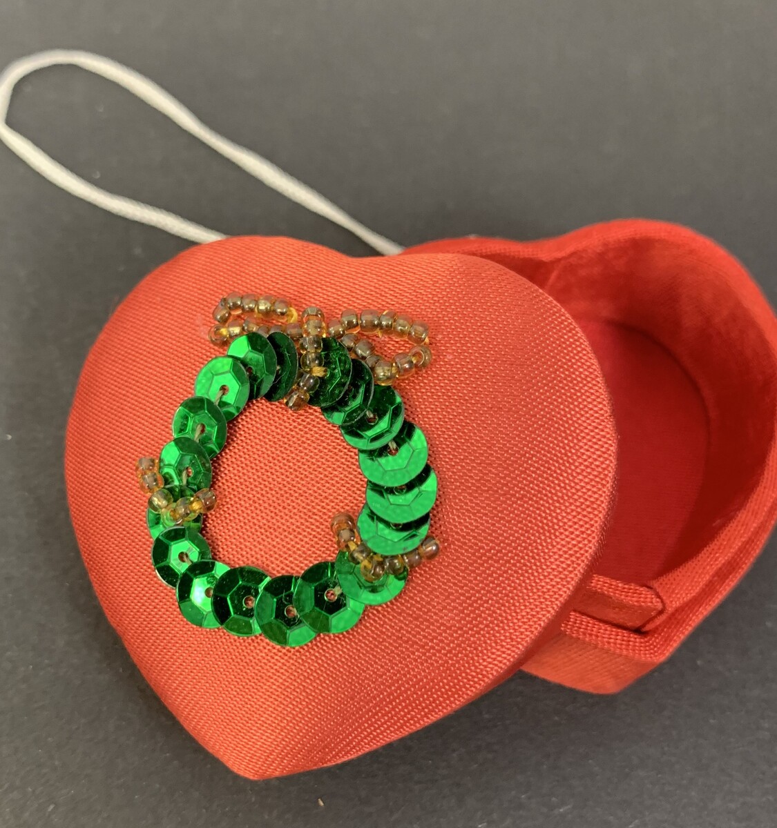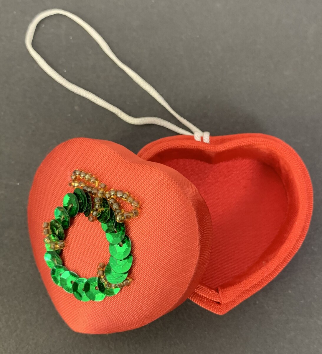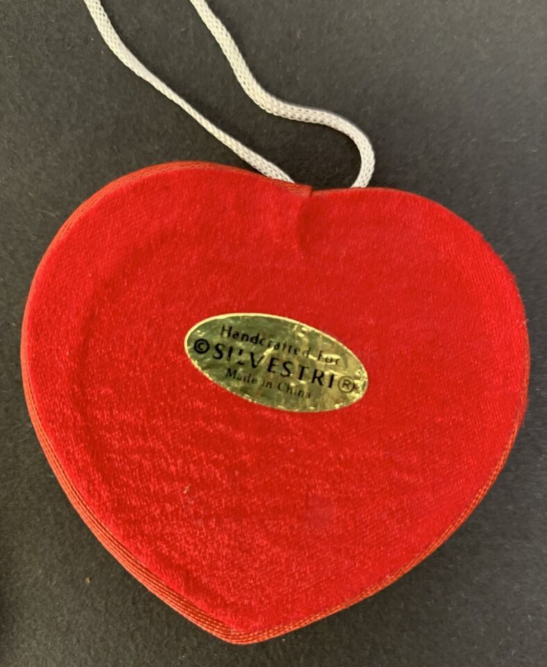 Vintage Christmas Silvestri Heart shaped fabric cushioned small Trinket Box or Gift Box or Ring Box. Has a sequin wreath crafted on the top. Perfect size to hold a ring and hide it on the tree as it does have a hang tie for a tree! Like new vintage, not stained or worn. Age estimated 1980's. 2 1/4" x 2 1/4" x 1" tall. A rare item!