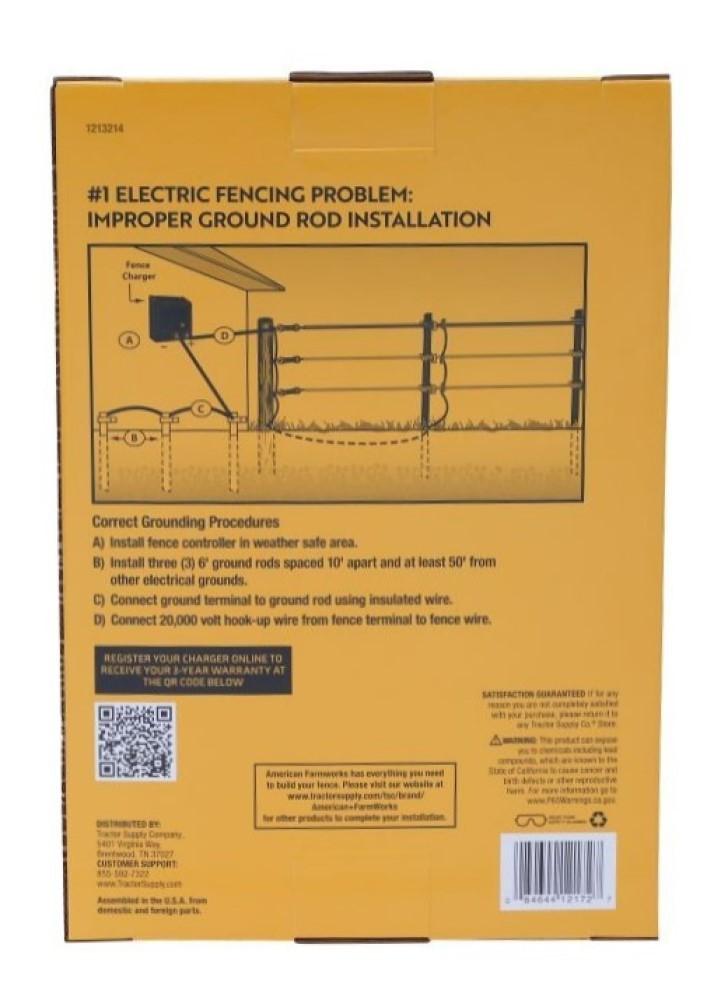 Energizes TSC-exclusive 15 miles of fence wire under optimal conditions in vegetation-free fencing Control many types of livestock, including cattle, goats, horses, pets, pigs, poultry and small wildlife Electric fence control box is plug-in powered with a standard 2-prong cord Can be used with all types of electric fencing wire, including high-tensile steel or aluminum wire, poly wire, poly rope and poly tape Fence OK indicator light shows when the American FarmWorks energizer is activated Easy-grip terminal knobs secure hook-up wiring 15-mile AC-powered fence charger mounts quickly with the hanging slots built into its sturdy case Joule output: 0.7 1-year limited warranty offers assurance, so remember to register within a month of purchase to secure the warranty