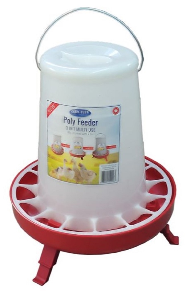 A chicken feeder with Adjustable Legs that adjust to three different heights for different stages of the bird's life Jug is made from high-density polyethylene. Can be hung
