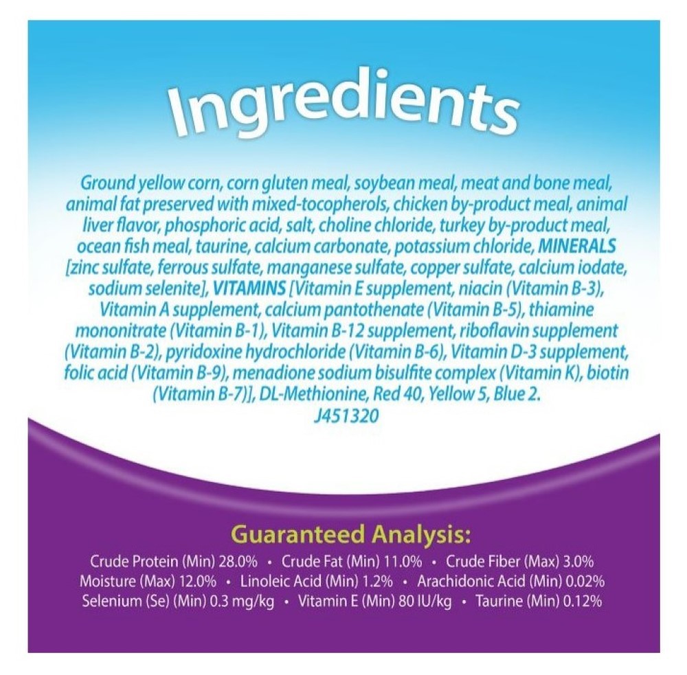 Blend of chicken, liver, turkey and ocean fish flavors offer a taste cats love Four fun shapes for a texture and variety cats love 100% complete and balanced nutrition for adult cats Essential vitamins and minerals help support overall health Dry cat food is crafted in USA facilities Crunchy kibble helps promote clean teeth Backed by over 90 years of research and innovation for a brand you can trust