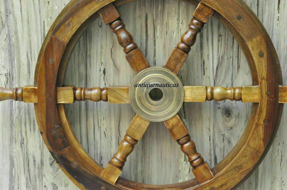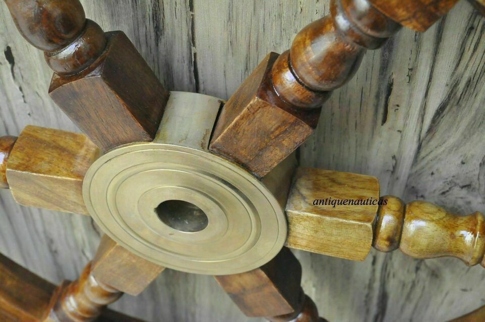 18"Nautical Wooden Ship Steering Wheel Pirate Decor Wood Brass Fishing Wall Boat