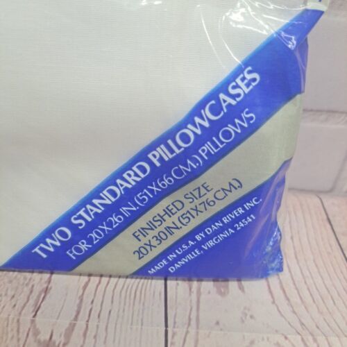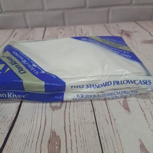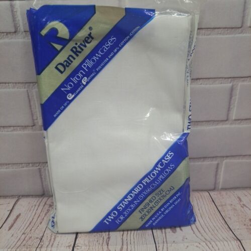 Vintage Dan River pillowcases set includes two solid white 20x30 inch cases made of a cotton blend. The pillowcases are from the USA, specifically Danville, and are designed with a no closure style. They feature a no-iron material that is machine washable for easy care.