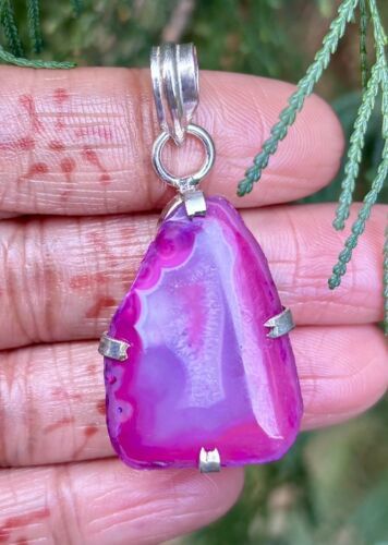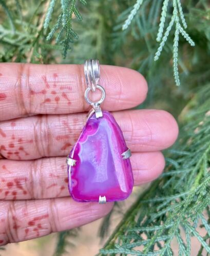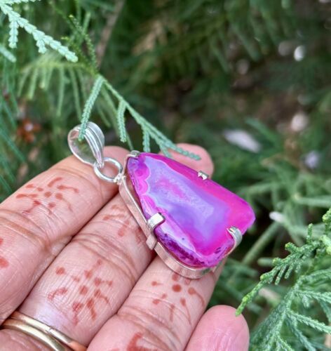 925 Sterling Silver Plated, PINK Druzy Geode Agate Stone Pendant, Healing 16