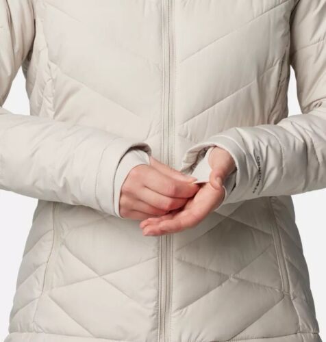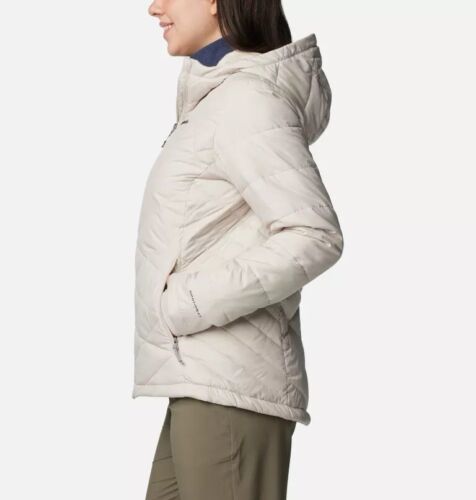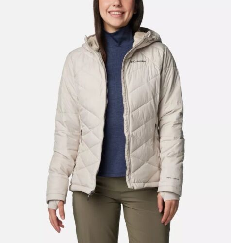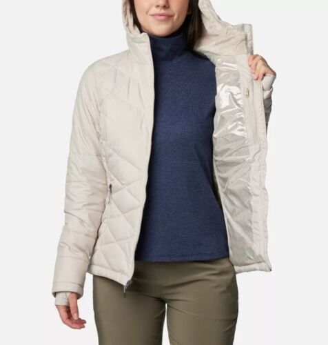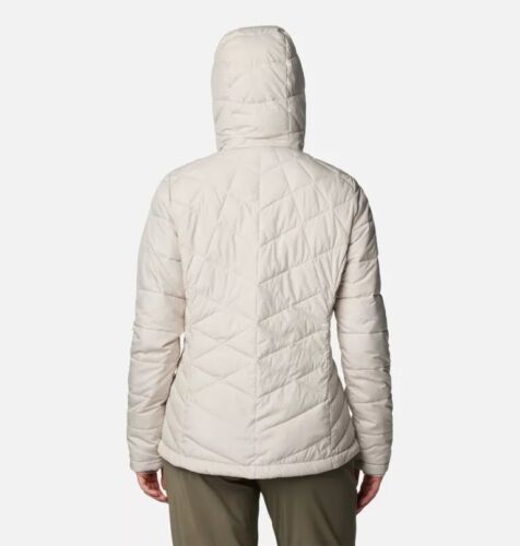 This is a Columbia Heavenly Hooded Jacket designed for women in size S. Made of polyester, it features a solid ivory color with quilted accents and a full zipper closure. The jacket is mid-length with long sleeves and is suitable for various occasions such as travel, parties, casual, or formal events. It is lightweight, hooded, insulated, water-resistant, and suitable for all seasons, including winter, fall, and spring.