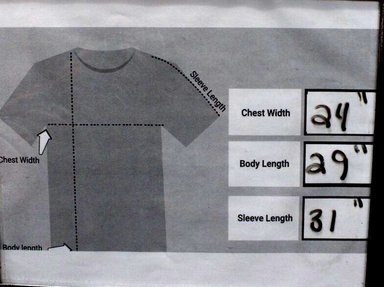 Chest width = 24 inches, Body length = 29 inches, Sleeve length = 31 inches