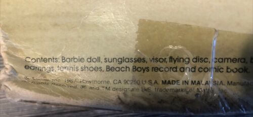 Comes with accessories such as hat, brush, beach boy record toy . Original box has some signs of wear such as scratches and discolorations .Made in Malaysia .