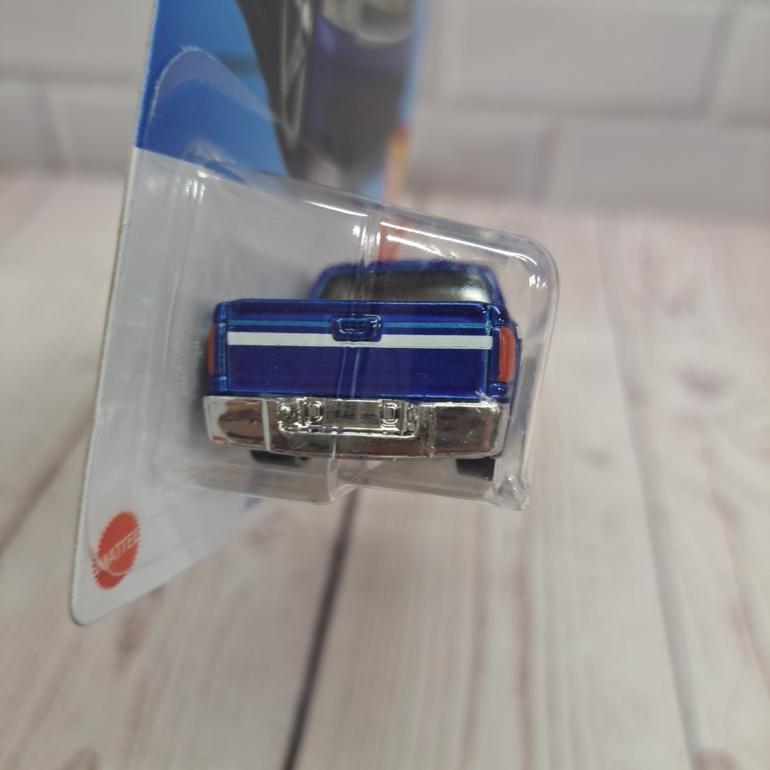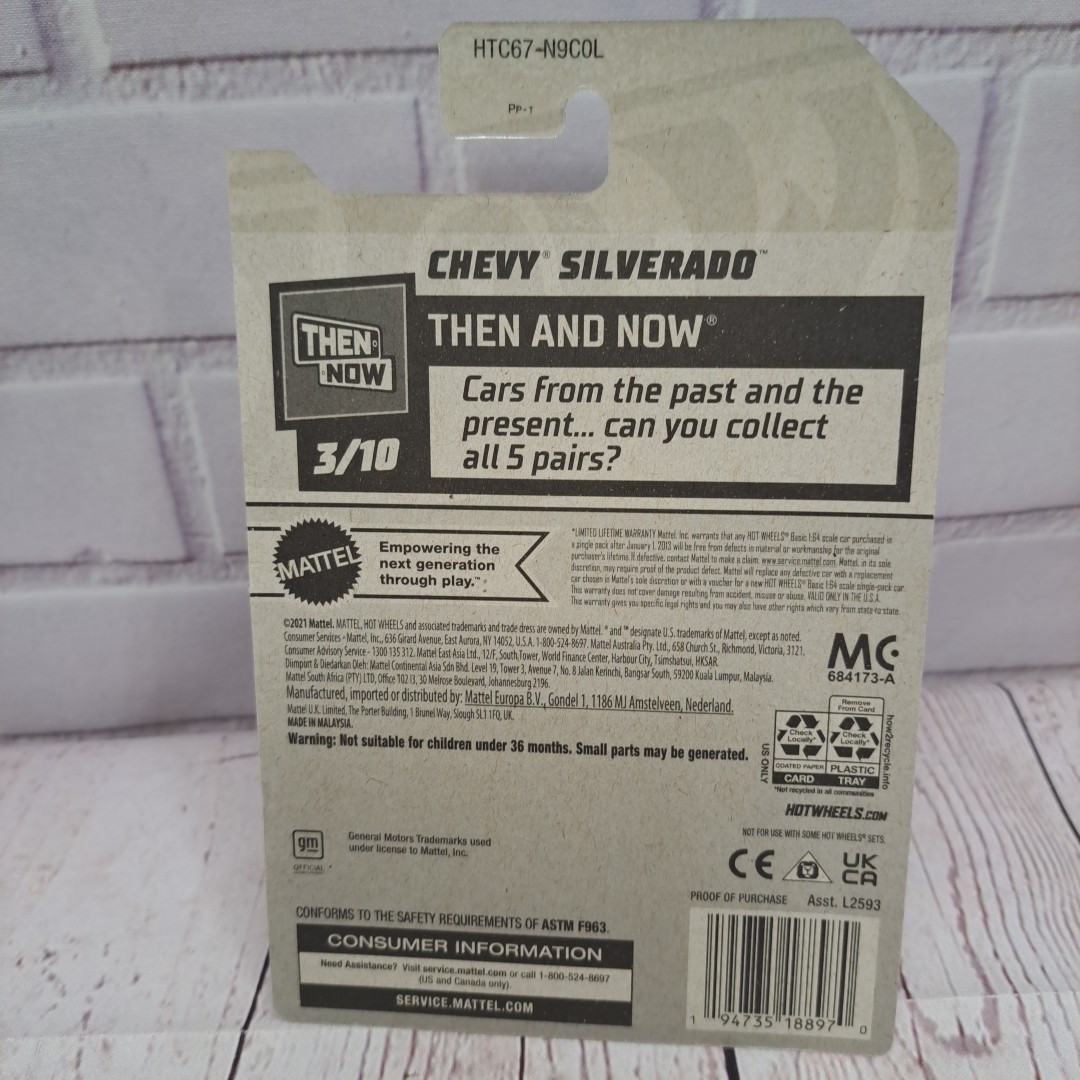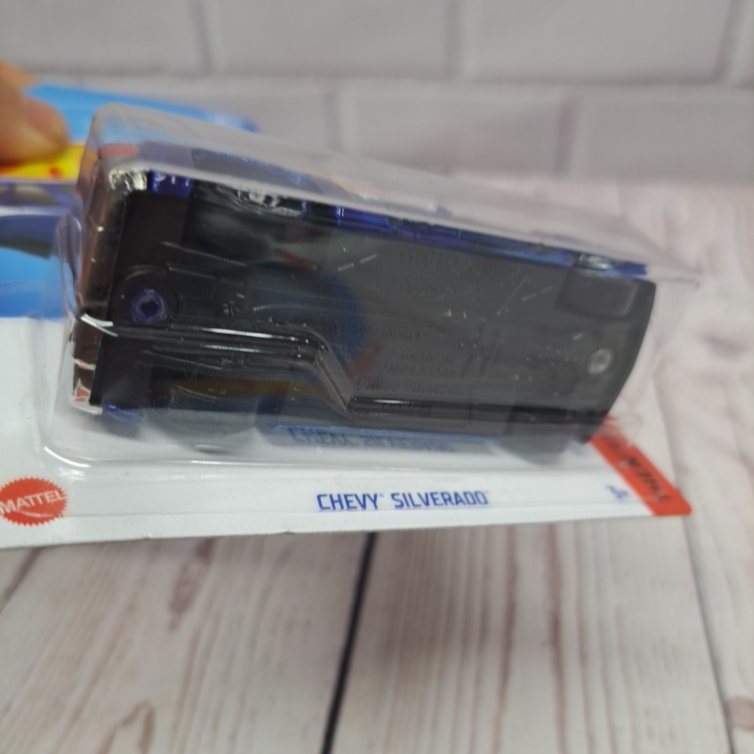 The 2024 Hot Wheels Chevy Silverado is a 1:64 scale pickup truck model in blue. It is part of the Hot Wheels Then And Now series, manufactured by Hot Wheels in 2021. This unopened box toy is designed for boys and girls aged 3 and above. The Chevy Silverado model does not feature any customization and is not autographed. Made in Malaysia.