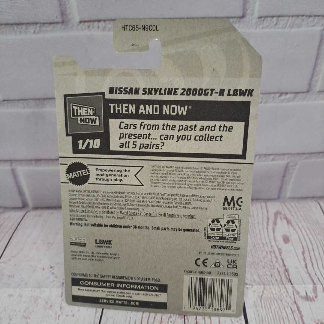 The Hot Wheels 2024 Gray Nissan Skyline 2000GT-R LBWK is a 1:64 scale diecast car from the Then and Now series. This limited edition special edition model of the 1992 Nissan Skyline GT-R features a JDM theme. It is part of the character family JDM and is recommended for ages 3 and up. The car comes in an unopened box and was manufactured in Malaysia in 2021.