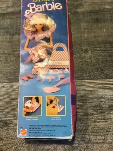 Gift Giving Barbie . She has a gift for you ! Presents for her friends too! . Original box has some signs of wear such as scratches and discolorations .Made in Malaysia .