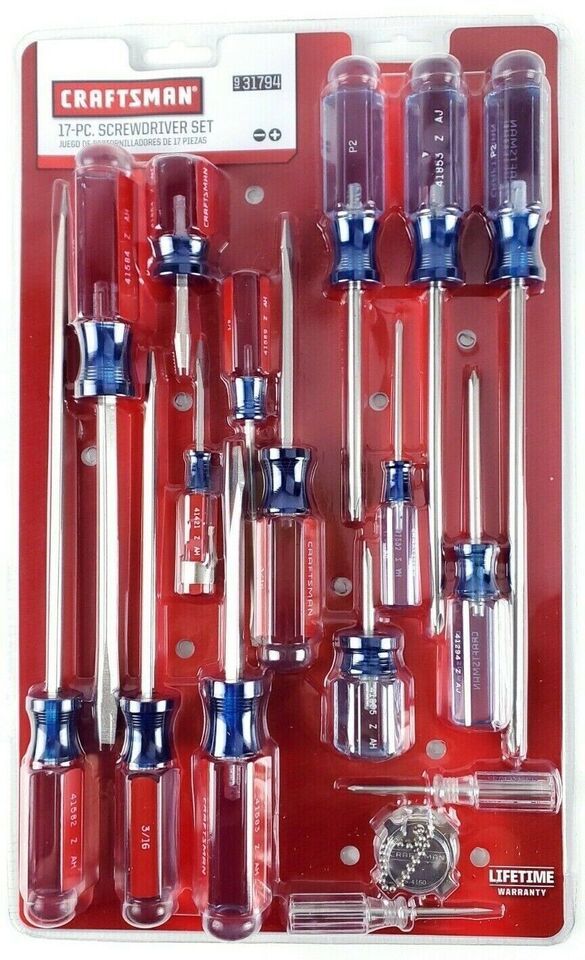 Whether you've got jobs around the house or the shop, you'll be ready for anything with this 17-piece screwdriver set. Perfect for first-time homebuyers or professionals, this set features Phillips blade tips and serrated, slotted tips of all sizes, so you'll find the right fit for any screw head. The blades are made of alloyed steel and heat treated to give you them strength and durability. You'll always be a step closer to done with these Craftsman screwdrivers.