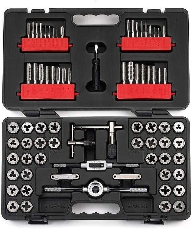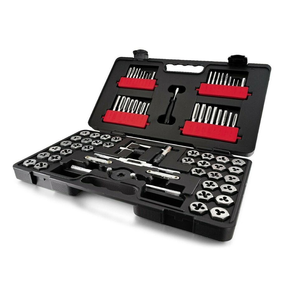 Set includes: 7 drive tools with accessories, 17 inch plug taps, 17 inch hex dies, 17 metric plug taps, 17 metric hex dies sturdy storage case with handle