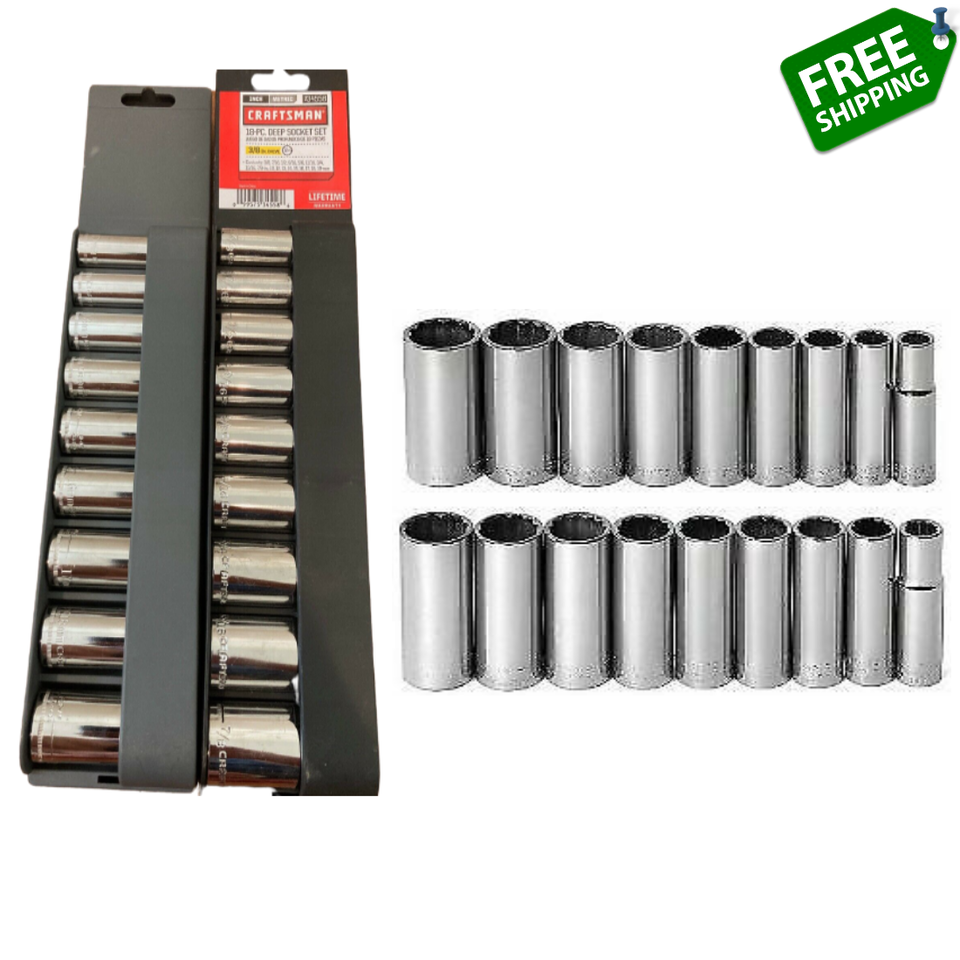 This Craftsman 18 pc 3/8 in Deep Socket Accessory Set gives you both metric and inch options, to fit any job you need to do. The deep sockets stay on tight and turn reliably, and the well-made solid set is chrome over vanadium steel. You can count on these sockets for years of use. Reliable precision-calibrated deep sockets run from 3/8 to 7/8 inches and metric sockets from 10MM to 19MM. Get the job done with Craftsman sockets. The 18 pc 3/8 in Socket Accessory Set is the tool kit you need for auto repair, whether American made or foreign. It has all the common sizes, for every project you have in mind. Your set comes in a convenient plastic try to avoid fumbling, and it's neatly organized by size and type to save you time. With Craftsman quality and Sears value, this is the socket set you are looking for. The Craftsman 18 pc 3/8 in Deep Socket Accessory Set has the tools you need Contains metric and inch sockets to let you work on any make of car you ever drive Get the tools you need to make short work of the toughest job.
